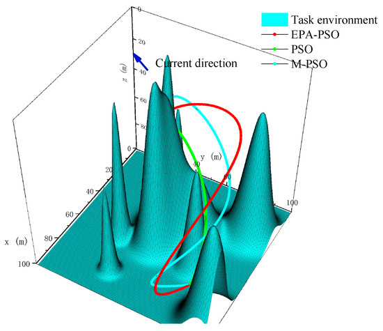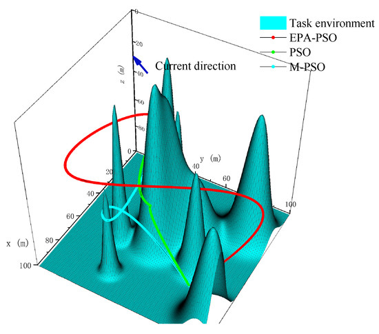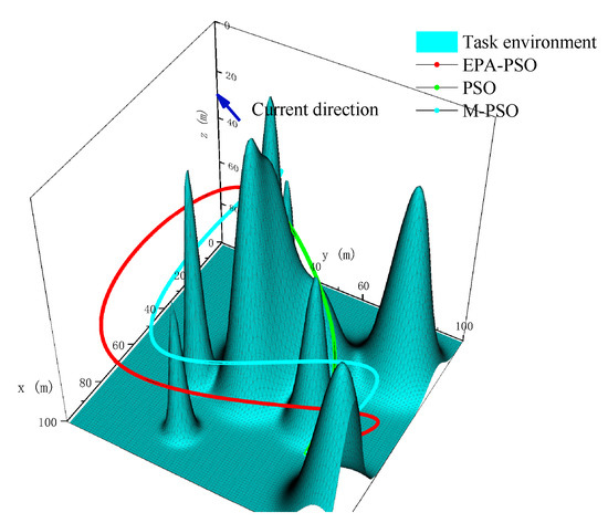 - The EPA-PSO algorithm proposed in this paper is compared with the traditional PSO algorithm, which can solve the energy-saving path planning problem that satisfies the mobility constraints of AUV in the environment of multiple obstacles and unsteady ocean currents. The feasibility of the EPA-PSO algorithm is verified.