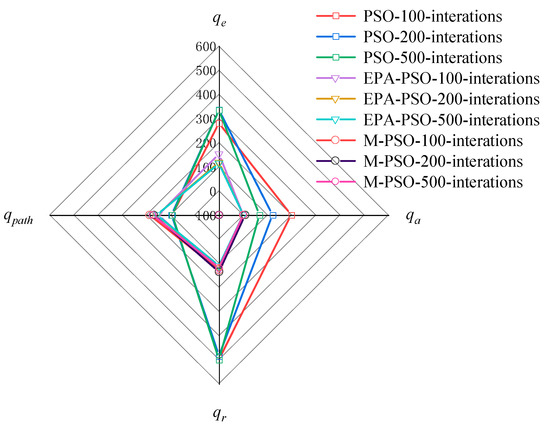 According to the new standard, it can be seen that the EPA-PSO algorithm proposed in this paper is more advantageous than the traditional PSO algorithm and M-PSO algorithm, and in the radar diagram the area enclosed by the EPA-PSO algorithm is the smallest in 500 iterations. Therefore, EPA-PSO proposed in this paper can solve the problem of AUV energy-saving path planning considering mobility constraints.