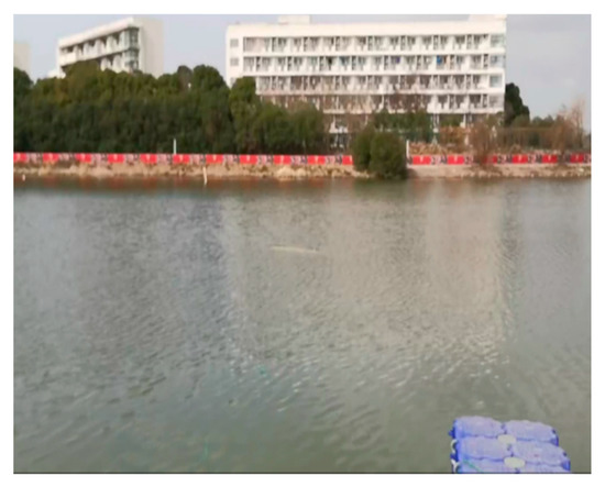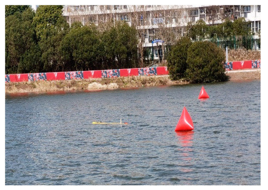 Due to the restriction of the shape of the obstacle, it is not easy to draw it in the figure. The obstacle is located at the corner of the planned route. The shape of the obstacle is the cone in Figure 29. To ensure the smooth progress of the experiment, we set a safe height of 3 m. When the height is less than 3 m, the AUV will rise to the surface immediately. At the same time, the AUV is navigated at a depth of 2 m. Through the algorithm proposed in this paper, a path satisfying the constraints can be planned. It can be seen from Figure 28 that the flow velocity in the test site is slow, and the actual flow velocity measured is about .
