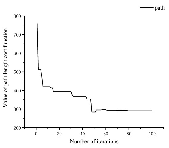 where is the initial value of the weight of the path cost, is the vibration coefficient, and is the maximum updating range of . If is larger than , will also be larger, which means that the attention to path length in the iteration is increased.