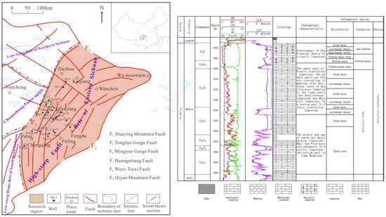 The Eastern Sichuan region is under the jurisdiction of the Chongqing–Fuling Line and includes counties such as Kaijiang, Wanzhou, Dazhu, Dianjiang, Fengdu, Yubei, and Fuling in Chongqing (Figure 1). It is located in the southern Sichuan Basin, among Mounts Huaying, Qiyao, and Daba. There are numerous ejective folds trending northeast–southwest in Eastern Sichuan from west to east. This abnormally developed fault belt includes Tongluo Gorge, Mingyue Gorge, and Huangnitang [25,27,28,29].