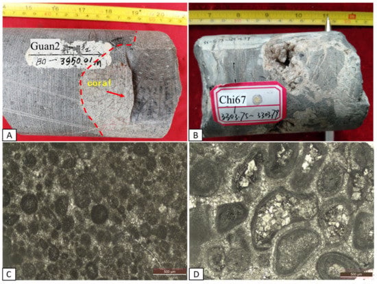 Petrological characteristics of platform margin shoal in P2m2a, Eastern Sichuan. (A) Bioclastic limestone with the development of coral in well Gou2. (B) Dolomite in well Chi67; the pores are filled with saddle dolomite. (C) Sparry oolitic and arenaceous limestone in well Wo83. (D) Sparry oolitic limestone in well Wo83, in which the oolitic particles are dolomitized.