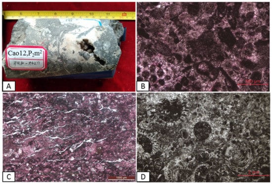 - Luo, B.; Wang, W.F.; Chen, Y.Q.; Xiao, D.; Cheng, Y.; Li, S.; Xu, F.B.; Tan, X.C. Sedimentary Characteristics of Middle Permian Maokou Algal Framework Reef Rock in the East of Sichuan Basin. Mar. Orig. Pet. Geol. 2015, 20, 53–61. [Google Scholar]