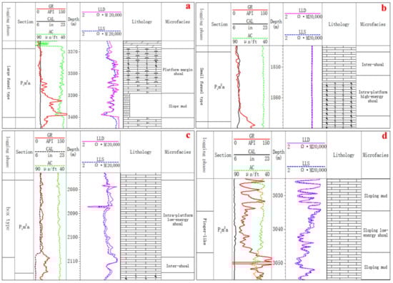 Well logging information can reflect the various physical properties of rocks [34,35,36], and different logging response characteristics indicate lithological changes in different sedimentary environments [25,37,38,39]. Among the many logging curves, the natural gamma curve reflects changes in the sedimentary environment [40,41]. Through a comparative analysis between core observations and thin section identification with the study results of natural gamma curves, it was found that the GR value of shoal facies sedimentary rocks was low. The GR value of the platform margin shoal facies was generally less than 27 API. The overall shape of the GR curve is a large funnel-type. The morphology of the GR curve shape shows abrupt contact at the bottom, and the GR value is low at the top, showing a small tooth shape (Figure 6a). The logging face of a platform marginal shoal indicates the strong hydrodynamic conditions of the sedimentary environments. The GR value of the intra-platform high-energy shoal was generally less than 30 API. The overall shape of the GR curve is a small funnel-type. The morphology of the GR curve shape shows abrupt contact at the bottom, and the GR value is low in the middle-upper part, showing a small tooth shape (Figure 6b). Compared with the platform margin beach, its bottom mutation degree is relatively small. The logging face of intra-platform high-energy shoal indicates shallow and strong hydrodynamic conditions in the sedimentary environment. The GR value of the low-energy shoal on the platform was generally less than 36 API. The GR curve is micro-serrated box-shaped (Figure 6c), indicating that the sedimentary environments were characterized by shallow water bodies and strong hydrodynamic conditions. The GR value of the sloping low-energy shoal was generally less than 42 API, showing a finger-like curve and indicating a low-energy deep-water sedimentary environment (Figure 6d).