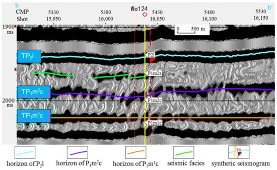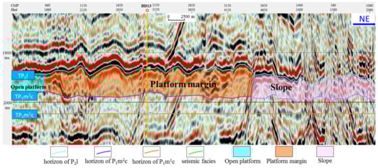 Before 2015, it was mainly believed that the overall sedimentary environment of the Maokou Formation in the Sichuan Basin was characterized by an open platform or ramp platform. In the late stage, the formation was affected by tectonic uplift and suffered weathering and denudation, and a karst fracture-cavity reservoir was developed. Since then, some scholars considered that the platform margin shoal of the late Maokou Formation might have developed in northern Sichuan based on the drilling seismic data of the whole basin [47]. In 2018, Well Yuanba 7 in northern Sichuan encountered the platform margin shoal reservoir of the Maokou Formation and obtained high-yield industrial gas flow. Its daily production is higher than that of the intraplatform beach reservoir, which confirmed the existence of the platform margin of the Maokou Formation in the Sichuan Basin for the first time and has broad exploration prospects. Therefore, we must change our concepts and re-learn the sedimentary facies types and distribution of the Maokou Formation in Eastern Sichuan according to the developing platform margin in late Maokou. This earlier study proposed the view that the platform margin was developed in the vicinity of the Linshui–Fengdu–Zhongxian area in P2m2a in Eastern Sichuan, and that the platform margin shoal is an important reservoir. Important evidence shows that the main rock type of the shoal facies in P2m2a is sparry bioclastic limestone, which has a high bioclastic sparry and dolomitization content. Bioclastics are mainly brachiopods, algae, and other paleontologies. Locally, wave-resistant corals are visible, indicating a high-energy wave-resistant environment. It is particularly worth mentioning that another important piece of evidence for the development of platform margin facies in the Maokou Formation in Eastern Sichuan is that there were obvious differences in the stratigraphic thickness on the seismic profile. The thickness of the platform margin was significantly greater than that of the platform and slope, and the external morphology was slightly hilly (Figure 15).