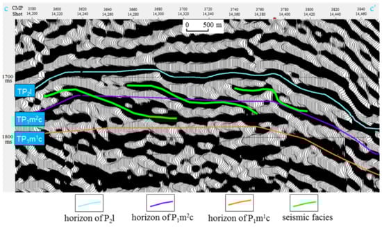 A seismic facies unit can be defined as a sedimentary unit, which is different from adjacent units in its seismic characteristics. Parameters that should be taken into consideration in the seismic facies analysis are as follows: reflection amplitude, dominant reflection frequency, reflection polarity, interval velocity, reflection continuity, reflection configuration, abundance of reflections, geometry of seismic facies unit, and relationship with other units [42,43]. Seismic facies analyses can be used to understand underground lithology, sedimentary environment, and the development of favorable reservoirs [44,45,46]. Different sedimentary facies often behave differently in seismic facies, particularly in high-energy turbulent sedimentary environments that show obvious abnormal seismic facies. The study area is located in the Eastern Sichuan tectonic belt, where high and steep faults are developed, the overall quality of 2D seismic data is poor, the signal-to-noise ratio is low, and the seismic imaging quality is poor. When the seismic attribute analysis was carried out, the seismic attribute effect at the location of the fault zone was not obvious, and the distribution range of the fault zone in the study area was very large. The abnormal seismic facies in the study area were identified as pro-gradational.
