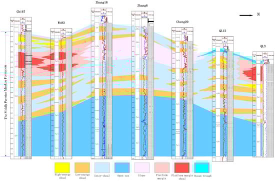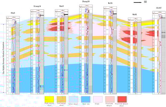 A joint well correlation analysis of sedimentary facies was conducted in the study area to study the sedimentary evolution of shoal facies in P2m2a in Eastern Sichuan. Based on the comprehensive correlation analysis of sedimentary facies of the Maokou Formation from the joint well section, we found that the sedimentary facies belts changed remarkably in the vertical direction. Open platforms mainly developed during the depositional period of the Mao 1 section to the Mao 2b subsection. Open platforms, platform margins, slopes, and low-energy shoals within the platforms were relatively developed in the Mao 2a subsection owing to sedimentary differentiation. Platform margin shoals, intra-platform low-energy shoals, and sloping low-energy shoals were also developed. Open platforms mainly developed during the depositional period of the Mao 3 section, (Figure 11 and Figure 12). Horizontally, the sedimentary facies were in the sequence of open platform, platform, platform margin, slope, and basin during the deposition of P2m2a from southwest to northeast. Intra-platform low-energy shoals were widely developed in the Yubei–Changshou area of Chongqing, with platform marginal shoals sparsely distributed in the Fengdu–Linshui area and sloping low-energy shoals distributed in Dianjiang–Dazhu.