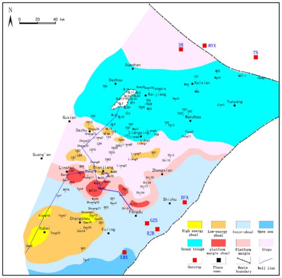 - Luo, L. Sedimentary Facies of Qixia-Maokou Formation in Northwest Sichuan Basin. Master’s Thesis, Southwest Petroleum University, Chengdu, China, 2017. [Google Scholar]