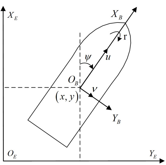Consider a group of USVs consisting of a virtual leader vehicle (subscript 0) and n follower USVs (subscripts ). The 3-degree-of-freedom (DOFs) kinematics and dynamics equations of the ith USV can be expressed in vector form as [39]