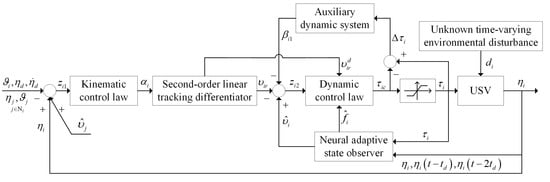 Some control strategies without velocity information have been proposed in the literature [9,10,11,12,13] such as the back-stepping observer approach [9], high-gain observer [10,11,12], passive nonlinear observer [13], etc. These control schemes have a common premise, that is, it is assumed that the vessel model parameter is known. However, due to imprecise measurements and external disturbances, accurate model parameters often cannot be obtained. In general, the hydrodynamic parameters of USVs are also time varying. It is emphasized that external disturbances and uncertainties can make the entire system unstable [14]. This increases the difficulty of measurement. In order to deal with uncertain dynamics, neural network (NN) approaches have been considered due to their inherent advantages including excellent approximation and learning performance [1,7,15,16,17,18,19,20,21,22].