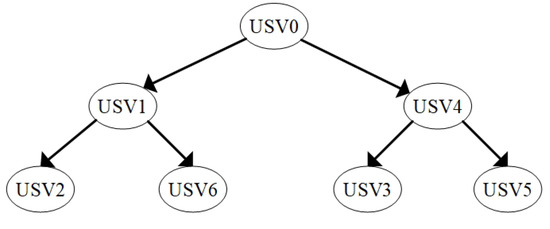 In this section, we simulate a USV swarm consisting of one virtual leader vehicle (indexed by 0) and four follower USVs (indexed by ) to demonstrate the effectiveness of the proposed method. The directed communication graph is shown in Figure 3.