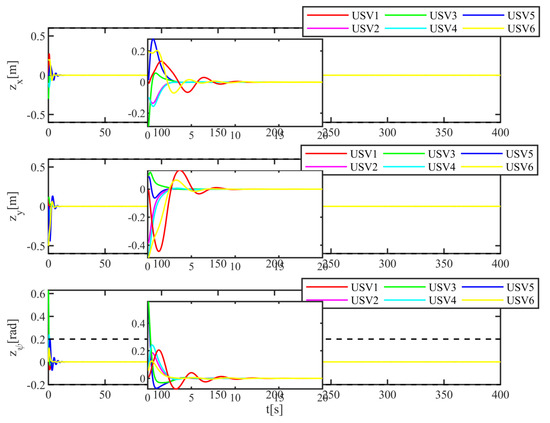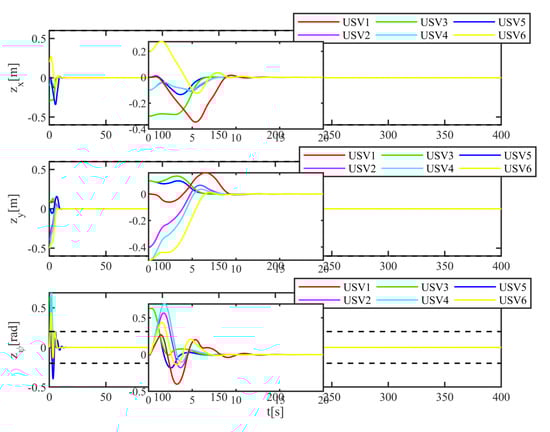 The simulation results are shown in Figure 4, Figure 5, Figure 6, Figure 7 and Figure 8. Figure 4 shows the trajectories of six USVs under time-varying environmental disturbance and input saturation. It can be shown that, after adjustment, the position and heading of six USVs can reach the present point, maintain the desired relative position between each other, and realize the swarm control of multiple USVs in a fixed formation, even if there is a position and heading deviation at the initial time. Figure 5 describes the tracking errors of four USVs, including the position and heading. It can be seen from Figure 5 that the tracking error is convergent. Figure 6 shows the control input of six USVs. According to the analysis of Figure 6, the control input is limited within the range of input constraints. Therefore, the input saturation can be realized using the ADS designed in this paper.