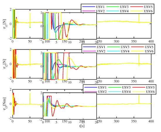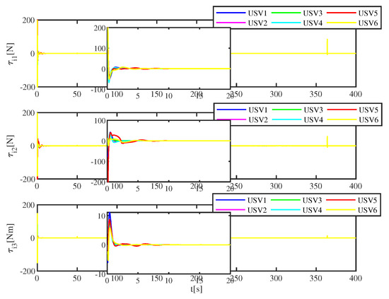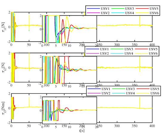 The simulation results are shown in Figure 9, Figure 10 and Figure 11. Figure 9 describes the tracking error of six USVs without ADS. Compared with Figure 5, it can be concluded that the tracking error fluctuates greatly at 0–10 s. Figure 10 shows the control input of six USVs without ADS. Compared with Figure 6, it can be concluded that the control input fluctuates greatly at 0–10 s. Figure 11 depicts the control inputs of six USVs without input constraints. It can be seen from Figure 11 that the maximum control force and moment is . Compared with Figure 6, the maximum control force and torque of the USV were exceeded.