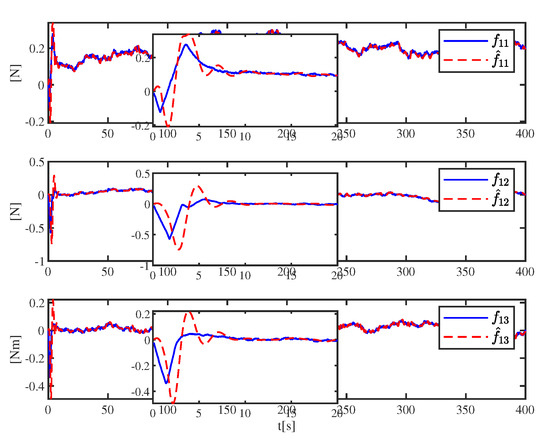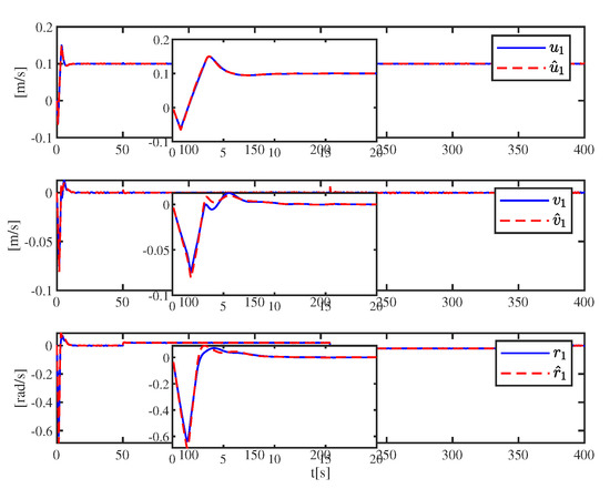 Taking USV 1 as an example, the estimation effects of the observer are shown in Figure 7 and Figure 8. Figure 7 depicts the comparison effect between the real value and the estimated value of the velocity. The solid lines and dashed line represent the real value and estimated value, respectively. It can be seen from Figure 7 that the designed NASO is effective and can realize the estimation of speed. Figure 8 describes the real values and estimated values of the total unknown function acting on the first USV. It can be seen from Figure 8 that the NASO is stable despite boundary estimate errors.
