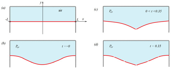 The simplified problem of highly unsteady two-dimensional motion of a thin visco-elastic plate after the plate breaking by a uniform slowly time-varying load is formulated as follows. Initially the plate is horizontal and corresponds to the interval , , see Figure 1a. The plate edges are clamped. Then a uniform load is applied to the upper surface of the plate. One can think about a sealed air chamber above the plate, see Figure 1a, where the air pressure is gradually increased up to a certain value , at which the plate deflection and the bending stresses in the plate are so high that the plate breaks into two parts but the air chamber continues to be sealed. The load magnitude p increases slowly in time, such that the plate deflection is quasi-stationary. The plate deflection before the plate breaks is governed by the equation , where and D is the plate rigidity, with the edge conditions . The solution of this boundary problem, , is even and smooth. It is given by the formula, , where . The strains on the plate surface are given by the formula, , where h is the plate thickness. The strain magnitude is maximum at the plate edges and have its local maximum at the plate centre, . Note that .