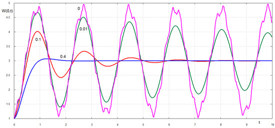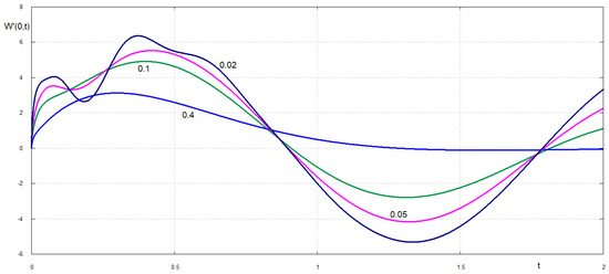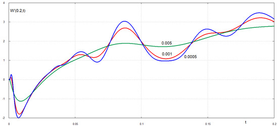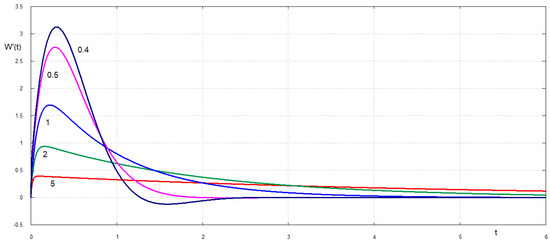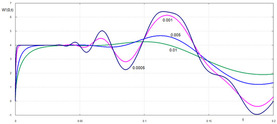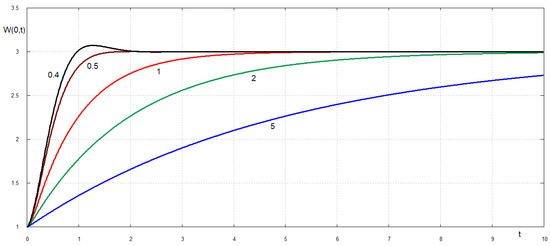 The solution of the problem (3) depends on a single parameter of the problem . Small values of imply that the retardation time is much smaller than the time scale defined in (2). The dimensionless deflection at the breaking place of the plate, , is shown in Figure 2 as a function of the dimensionless time t for different values of the parameter . The deflections and velocities of the plate are computed with 1000 terms retained in the series (12) and the dimensionless time step . The static deflection of this edge of the plate is 1 at the time of breaking and 3 for large time, see the formulation of the problem (1). The unsteady solution (12), (14) and (15) slowly approaches the limiting value 3 for large without oscillations. For overshooting is observed. The unsteady plate deflection at arrives at the static deflection 3 at for .
