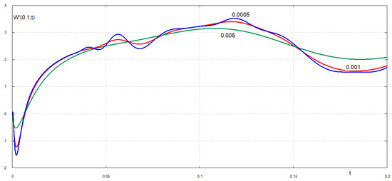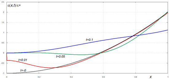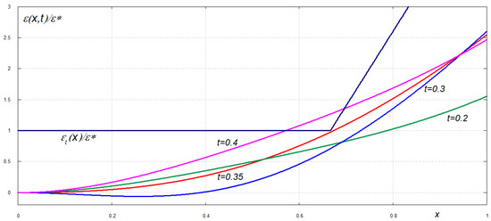 is violated. The scaled strain distributions, , along the plate, , at different time instants are shown in Figure 9 and Figure 10 for . Here and . The displacement of the plate free edge for such dimensionless retardation time is shown in Figure 3 by green line. Figure 9 illustrates quick changes in the strains after the plate break. It is seen that the solution by the normal mode method does not satisfy the condition of zero stress at up to , which is of order of . For such an initial stage, an inner solution near the free edge is required. Later, at , the strains are rather released even near the clamped edge of the plate, see blue line in Figure 9. Then the strains start to increase with rapid changes in time between and . At the fracture condition (19) is violated. This implies that at this time the plate breaks at , on the border between the weak inner part of the plate and stronger plate part near the edge, where the plate is clamped. Therefore, our solution (12) can be used only in the interval . Then the plate beaks again. We can continue our calculations of the plate motion—actually, motions of parts of the original continuous plate—by formulating boundary problems similar to (1) for the intervals and . It is possible that the plate breaks then third time near the clamped edge. The plate pieces close to the plate centre are free-free plates, which are not expected to break due to their vibrations after the secondary breaking.