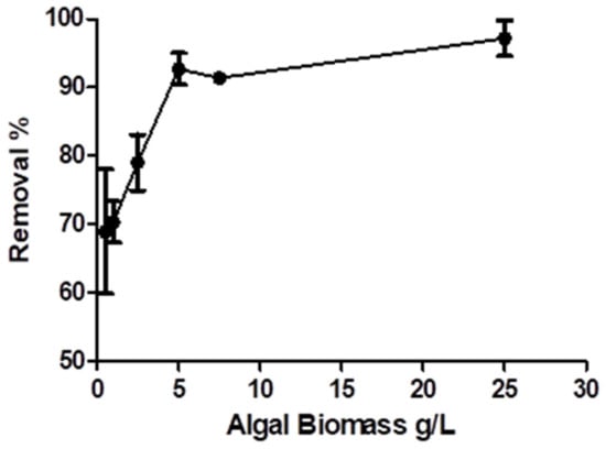 The tendency of the percentage of Cd removal increased following the higher algal biomass concentration and eventually tended toward 100% metal removal (Figure 1). The heavy metal ion removal rate of AD1 biomass increased from 68.9% of 0.5 g/L to 92.7% of 5 g/L, and the removal efficiency increased to 97.2% when algal biomass reached 25 g/L. Therefore, the optimum algal biomass dose was found to be 5 g/L, which was selected for the rest of the experimental studies. On the other hand, the removal percentage of the 7.5 g/L biomass dosage was less than the 5 g/L dosages by approximately 1.3%. However, the expected result was that the removal percentage of the 7.5 g/L biomass concentration should be higher than that of 5 g/L. The actual result might have been due to the various AD1 biomass conditions, such as the cell density of the biomass and the integrity of each cell in the biomass, illustrating that the broken cell in the biomass may affect the adsorption ability. In summary, it can be considered that the Cd removal depended on the concentration of microalgal biomass used in the adsorption environment. The efficiency of removal performance increases with the number of adsorption sites [15]. The design and planning of the following testing concentrations were based on these results.