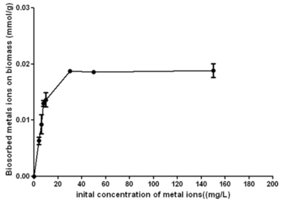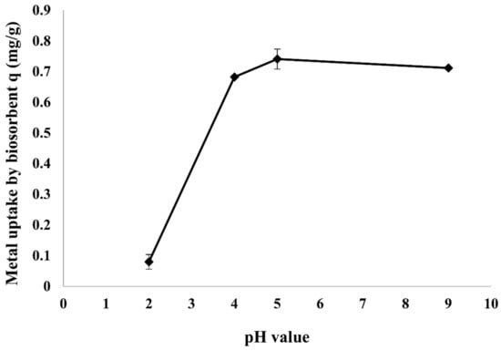 The pH value is one of the most crucial parameters to determine the effect of biosorption. As the biosorption describes the ion exchange from the binding places with heavy metals, the variation in the pH value may influence the uptake capacity. There are a variety of functional groups on the cell surface, for example, the carboxylic group, which means pH dependence of the biosorbent is largely related to their surface functional groups [20,21,22].