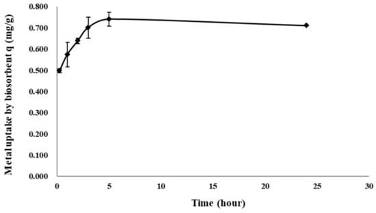 Effect of contact time on biosorption of Cd (biomass dosage: 5 g/L; Cd initial conc.: 4 ppm; temperature: 27 °C; pH: 5.0).