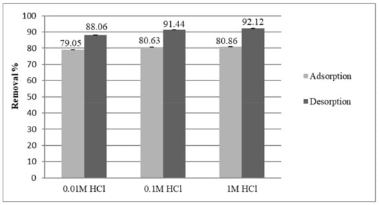 Based on the experimental result, 0.1 M HCl has the highest yield on Cd recovery. Therefore, HCl was found to be an effective desorbent for Cd recovery. The desorption ability of hydrochloric acid (HCl) was then investigated. The performance of three concentrations of HCl—0.01 M, 0.10 M and 1.00 M—was determined and is shown in Figure 5. The Cd adsorption capacities of the biosorbent were similar in percentage (79.05%, 80.63% and 80.86%) in the previous biosorption experiment. The Cd removal abilities of 0.01 M, 0.10 M and 1.00 M HCl were found to be 88.06%, 91.44% and 92.12%, showing an increasing trend with increasing HCl concentration. It was found that the highest removal ability was 92.12% using 1.00 M HCl. A higher concentration of HCl leads to a better desorption ability, since a higher concentration of HCl can provide a higher ability to bind with cadmium ions that are bound with the biomass.