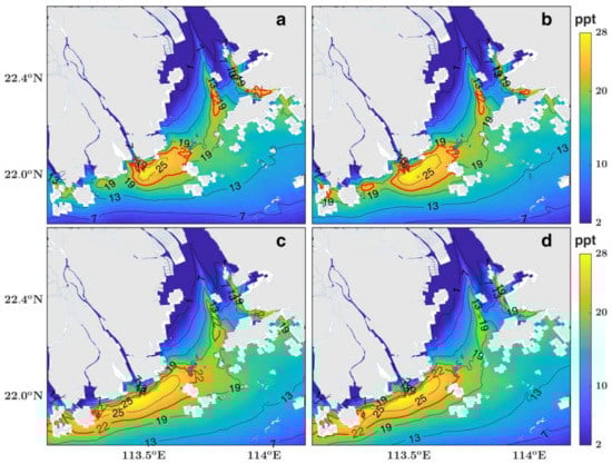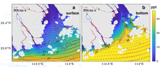 - Gong, W.P.; Lin, Z.Y.; Chen, Y.Z.; Chen, Z.Y.; Zhang, H. Effect of winds and waves on salt intrusion in the Pearl River estuary. Ocean Sci. 2018, 14, 139–159. [Google Scholar] [CrossRef] [Green Version]