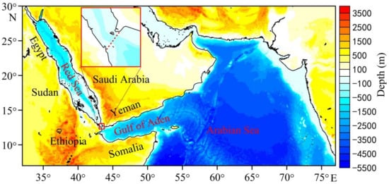 Figure 1 shows the locations of the Red Sea and its adjacent seas. The Arabian Sea, located in the northwest Indian Ocean, is connected to the Gulf of Aden, which is connected to the Red Sea through the Bab-el-Mandab Strait. The average depth in the Red Sea is 558 m, and the maximum depth of the trench along the axis is 2922 m. The topography data are from the General Bathymetric Chart of the Oceans (GEBCO_2014) with a resolution of 30 arc-second interval grid (https://www.gebco.net/data_and_products/gridded_bathymetry_data, accessed on 11 June 2022).