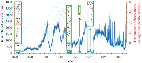 Monthly series of the numbers of raw SST measurements (ICOADS) within Red Sea. The dots are valued by the right coordinate axis, standing for the enlarged figure of partial line segments.