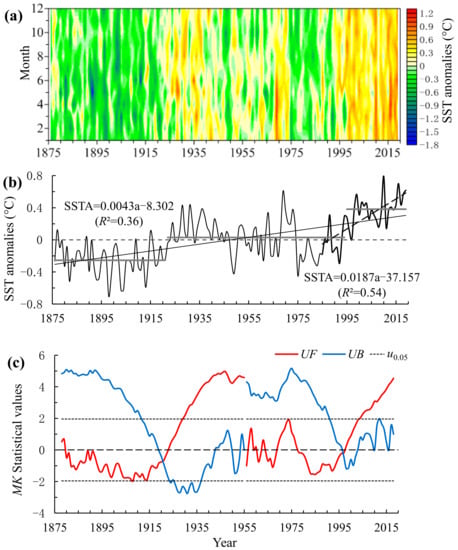 The abrupt change in annual mean SST was analyzed using the MK (Mann–Kendall) test [29]. In MK statistics, α = 0.05 is the significance level, UF is the MK statistics of anomaly time series, and UB is that of time-reversed anomaly series. If UF > 0, it represents an increasing trend, and vice versa. When UF exceeds two critical lines of u0.05 = ± 1.96, it represents a significant upward or downward trend. If the intersection point of UF and UB is between the lines, it corresponds to the starting time for the abrupt change.