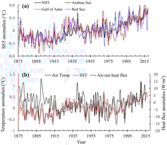 To determine if there is a dominant relationship between SST and air temperature of the Red Sea, we conducted cross-correlation analysis on their annual and monthly series individually. In Figure 5b, the maximum cross-correlation coefficient of annual anomalies was 0.84 when the time difference was 0. This further proves that annual variations in air temperature and SST were synchronized in the long run. In a monthly difference curve (RS_SSTA-ATA, Figure 5c), the maximum coefficient was 0.68 (p < 0.01) when the time difference was 0; thus, air temperature and SST monthly anomalies had the greatest cross-correlation in the same month. This suggests that the monthly variations in air temperature and SST anomalies were synchronized in general, and there was no significant time lag. Therefore, from the perspective of long-term warming, the rise in air temperature did not occur earlier than that of SST. Raitsos et al. [7] reported that air temperature shifted 1 month earlier than SST, and accordingly proposed that air temperature influenced water temperature in the Red Sea. However, their analysis (for the period of 1985–2007) was based on temperatures rather than anomalies, and is not enough to prove that the air temperature rise induced the Red Sea warming from the perspective of long-term change, even though seasonal variations in air temperature usually happen earlier than those of water temperature. Our analysis (RS_SST-AT, Figure 5c) for air and water temperatures (not anomalies) also indicated this phenomenon. The cross-correlation coefficient was 0.975 (p < 0.01) when the lag was 1 month for SST, larger than that (0.924, p < 0.01) of the zero lag. In addition, the cross-correlation for SSTs of the Red Sea and Gulf of Aden was also the strongest when the lag was 1 month for the Red Sea (RS_AD-SST, Figure 5c).