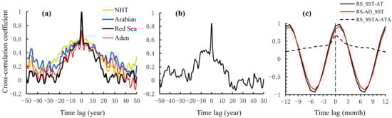 Correlation analysis for Red Sea SST. Cross-correlation coefficients between annual SST anomalies of Red Sea and those of adjacent seas and NHT (a) and Red Sea air temperature anomalies (b); (c) cross-correlation coefficients between Red Sea SST and air temperature (RS_SST-AT), Red Sea SST anomalies and air temperature anomalies (RS_SSTA-ATA), as well as Red Sea SST and Gulf of Aden SST (RS_AD-SST). A positive lag represents SST/SSTA series lagging behind other variables.