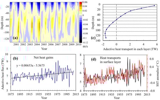 Figure 6a presents the vertical profile for monthly average zonal velocities (the negative means inflow) at the Bab-el-Mandab Strait during 2001–2010, displaying the aforementioned pattern [14,15,16,18]. Figure 6b presents the variation in estimated annual net heat transport to the Red Sea during 1876–2010. The net flux was always positive with an average of 7.13 × 1012 W over the years. Distributed over an area of 4.38 × 105 km2, the gain for the Red Sea was ~16.3 W/m2. Correspondingly, the heat loss for the Gulf of Aden (2.2 × 105 km2) was ~32.4 W/m2, which is close to an observed value of 35 W/m2 [10]. Figure 6c demonstrates the vertical distribution of the average annual heat transported to the Red Sea at each layer of the strait during the period. The heat was transported into the Red Sea through the upper water and out of the sea through the deeper water, tallying with the aforementioned pattern in the Introduction [18]. To further verify the rationality of using SODA, we contrasted the variation trends of the annual heat transports in the surface layer (upper 10 m in depths) from the Gulf of Aden and SST anomalies of the gulf (Figure 6d). During the period, the average rise rates of the former and the latter were 0.056 TW and 0.045 °C per decade, respectively. On the whole, they increased synchronously and their Pearson correlation coefficient was 0.42 (p < 0.01), showing a moderate positive correlation. Given that the two series were obtained from different datasets, this correlation reflects the long-term variations in heat transport between the two seas objectively. Therefore, the above results demonstrate the rationality of using the SODA to analyze the long-term variations in the heat flux and estimate the heat gain.