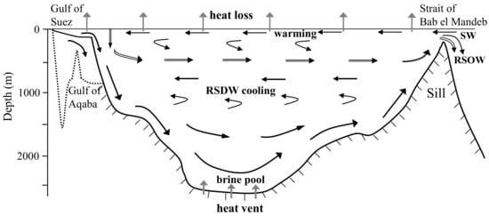 As determined by comprehensive analysis of our results and aforementioned previous studies, the cause for the warming of RSSW is summarized as follows and represented with a schematic (Figure 7, referring to previous circulation pattern [38]). The upper fresh warm water from the Gulf of Aden flows into the Red Sea due to the wind and thermohaline forcing. The overall wind direction is in fact northward annually at the strait [41]. Against the background of global warming, RSSW became warmer with the long-term increase in the temperature of external water. This strengthened the evaporation and made RSSW lose more heat to the air. When moving northward, the water is cooled and becomes more saline and denser, then sinks, and finally partially flows out of the sea over the strait sill [38,42,43]. Together with the sinking water of the Gulf of Suez and Gulf of Aqaba due to evaporation and convection [44,45], RSDW’s past trend of cooling might play a role in balancing the difference between RSSW warming and external net heat flux.