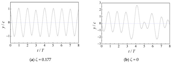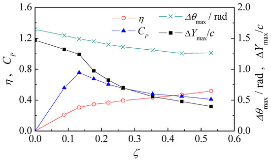 As mentioned in the previous section, since the coupled-mode flutter of the system results from the interaction of the double-elastic-constrained foil and the fluid flow, the designer of such a turbine could only indirectly control the foil motions by adjusting the structural parameters that govern the system’s dynamics. Therefore, in order to obtain the energy efficiently, on the one hand, the system parameters in the motion equation should be reasonably configured to make the hydrofoil flutter continuously; on the other hand, the appropriate damping coefficient (representing power output) should also be discussed to achieve the highest energy-conversion efficiency. Here, on the basis of a series of research results conducted by Boudreau et al. in 2018 [