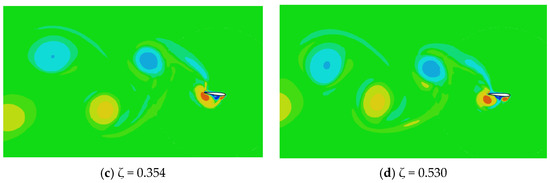 The motion parameters of the double-elastic-constrained flapping-foil system are also affected by the variation of the damping coefficient. The heave amplitudes of the foil always decrease gradually with the increase of the damping coefficient. Although the pitching amplitudes also show a downward trend, the pitch amplitude of the foil keeps a large value under all damping coefficients (about 70~90°). The large pitch amplitude will inevitably make the foil work at a large angle of attack. In addition, the damping coefficient will also affect the periodic characteristics of the flapping hydrofoil’s motion. At a higher damping coefficient, the motion of the foil presents obvious periodic characteristics. The heave displacement is close to the sinusoidal curve, while the pitch angle curve is much fuller; at a small damping coefficient, the periodicity of the foil motion is not obvious, and the randomness is enhanced. This randomness characteristic is more obvious when there is no damping.