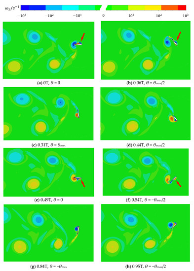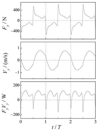 In summary, high-efficiency results are obtained for many combinations of the parameters, and the investigation could help us to identify the range of the parameters providing high energy-extraction efficiency. The numerical results agree well with previous experimental measurements and, in addition, allow access to the velocity and vorticity fields, as functions of space and time, and input power characteristics and the force characteristics, which in turn allows us to identify the underlying energy-extraction mechanisms more easily.