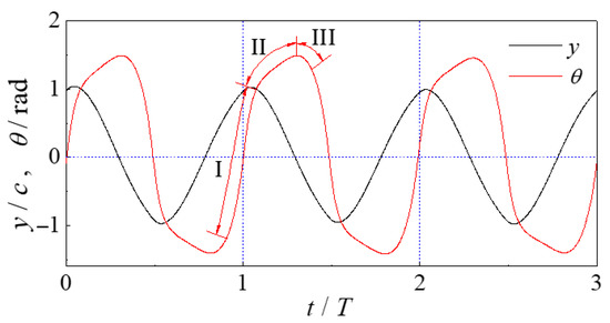 y direction force) and head rolling moment at the same time and begins to move. According to the dynamic relationship between the components of the system, the elastic-constrained foil could be considered as a linear mass–spring system, and its heave and pitch motions are governed by the second-order oscillator equations as follows.