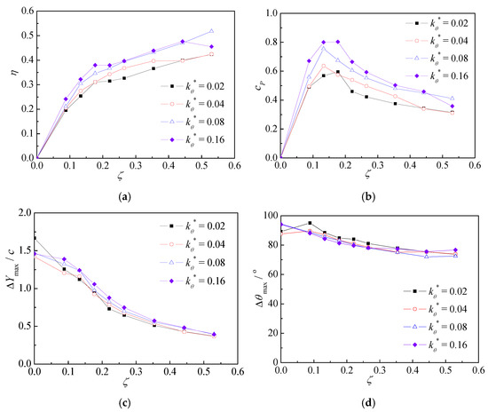 At the end of this section, the influence of the heave spring stiffness coefficient kh* and frequency ratio in the heave direction ωh* on the performance of the flapping hydrofoil is discussed. The double-elastic-constrained flapping-hydrofoil system obtains energy in the heaving direction, that is, the damping is applied to the heaving motion. Thus, the damping coefficients ζ will be greatly affected when the spring stiffness and the mass of the heave system are adjusted and then affect the performance of the whole system.
