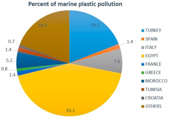 In the marine environment, plastic waste is a great environmental problem and is becoming a “world crisis” since it is everywhere, from surfaces to deep waters []. Scientific literature estimates the overall amount of plastic waste in marine environments to be variable from 86 to 140 million tons concentrated in five oceanic hotspots, nicknamed “plastic islands” and distributed as follows: two in the Pacific Ocean, two in the Atlantic and one in the Indian []. Furthermore, there is a sixth “garbage patch”, invisible and concealed in the Mediterranean Sea, mainly composed of microplastics, which are microscopic particles between 5.0 mm and 0.1 μm in diameter. Microplastics are small plastic fibers originating from the degradation of larger plastics pieces. The possible sources of these particles come from clothes, paints, tire dust, plastic litter and personal care products. In this way, according to an updated analysis, 229.000 tons of plastic flow yearly into the Mediterranean waters [], and actually, more than 1 million tons of plastics is present in the basin, representing a serious risk for marine ecosystems [] and for human health []. However, the real effects of microplastics on marine biota and on human health are still unclear and huge efforts are required to really assess the impact of microplastics [,]. Among the Mediterranean countries, about 70% of this heavy loading comes from three regions, divided as follows: 43.1% Egypt, 19.1% Turkey and 7.6 % Italy (Figure 1), as highlighted by the World Wild Fund Report 2019 []. Otherwise, if we consider only the plastic pollution caused by terrestrial sources, such as from coastline populations and river inputs, the relative rate per cent of Mediterranean coastal regions, in decreasing order, are the following: Turkey (97%), Morocco (94%), Israel (90%), Spain (89%), France (86%), Syria (86%), Egypt (84%), Albania (84%), Tunisia (82%) and Italy (80%) [].