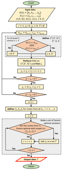 Let us introduce Algorithm 1 for finding a complete set of Pareto-optimal solutions for objective functions . A block diagram for the algorithm is presented in Figure 2. The developed algorithm is based on checking all pairs . For each of these pairs, we form a new graph , employ the EWA with a recursive function in the backpropagation search, and find the set of equally optimal solutions of (9) on. Not every found for a particular pair belongs to the set of Pareto-optimal routes. An additional examination of routes’ non-deterioration in the sense of their objective values when shifting from is required.