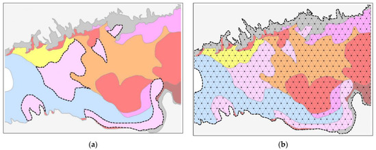 Let us define graph ) with triangular cells to the entire area of the ice map (Figure 3b). The edge size of the graph is , and the cardinality of the sets of vertices and edges of the graph is and , respectively.