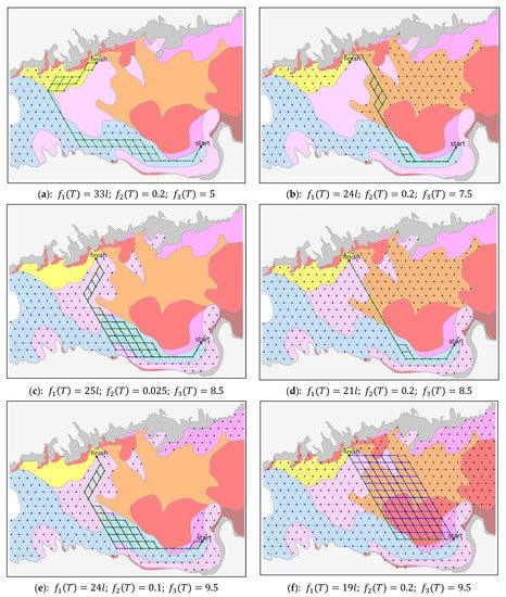 Let us perform Algorithm 1 (Figure 2) for solving problems (9)–(13) and find sets . Due to peculiarities of the ice chart, 15 of them turned out to be empty; the information on the others is provided in Table 3. Eventually, only six sets of make up the Pareto-front; corresponding cells in Table 3 are shaded with grey. Here, we enumerate them as follows: . The values of the objective functions for routes from along with are presented in Table 4. Figure 4 shows the ice chart with all the Pareto-optimal routes, 58,037 in total.