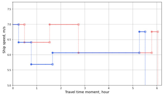 It is difficult for a user to work with such a large set of optimal solutions. Let us reduce the number of solutions of interest by applying an additional objective function (14) that optimizes solutions in terms of the total travel time. For this, we have taken the parameters (Table 5) of a random ship. Using these parameters, Formulas (2)–(7) of the ship performance model, thresholds of ice concentration and for (7), and coefficients listed in Table 1, we can find velocity of a ship in any node of the graph with known . Here, we have taken and as 4 and 10, respectively.