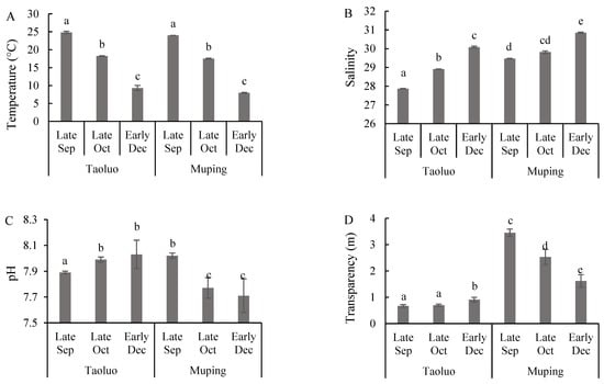Water temperature (A), salinity (B), pH (C), and transparency (D) in Taoluo and Muping laver farming area in September (Sep), October (Oct), and December (Dec). The different letters in each row shows that the values are significantly different (p < 0.05).