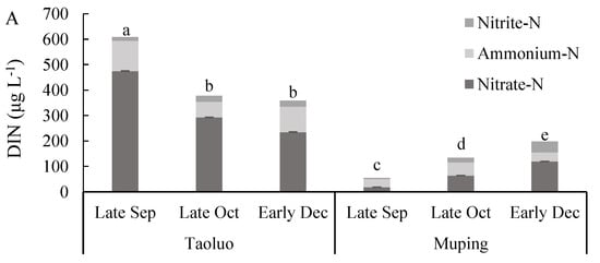 The concentrations of DIN were significantly higher at Taoluo than at Muping at the same sampling time (Figure 3A). In Taoluo, DIN decreased from Sep to Oct (p < 0.05). Among the DIN, nitrate was the dominant nitrogen at all study times and nitrite was the lowest. Nitrate decreased seasonally, ammonium decreased from late Sep to Oct and then increased in early Dec, and nitrite was the lowest in Sep. In Muping, both DIN and nitrite increased linearly from late Sep to early Dec (p < 0.05). In late Sep, ammonium was the dominant DIN and the composition of nitrite was the lowest. In late Oct, all three kinds of DIN increased and the concentration of ammonium-N became similar to that of nitrate-N. In early Dec, the concentrations of nitrate and nitrite increased and the concentrations of ammonium decreased to the level of late Sep. Nitrate became the dominant DIN and the levels of nitrite-N and ammonium were similar.