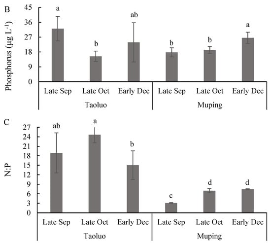 The differences of DIP (phosphate-P) concentrations between the two study regions were much less than the differences of DIN. DIP levels were higher in Taoluo than in Muping in late Sep (p < 0.05) and they were similar in both regions in late Oct and early Dec (p > 0.05). The DIP concentrations in Taoluo were significantly lower in late Oct than in late Sep and early Dec. The DIP levels in the water samples were significantly higher in early Dec than in late Sep and Oct in Muping (Figure 3B).