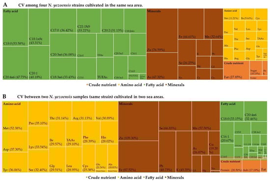 Treemap of coefficient of variation (CV) of crude nutrient, amino acid, fatty acid, and minerals among the four N. yezoensis strains cultivated in the same sea area (A) and between two N. yezoensis samples (same strain) cultivated in two sea areas (B).