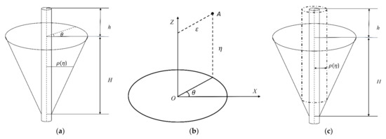 In view of the settlement of a soft soil foundation in the coastal area of South China caused by a PVD, the stochastic medium model states that after the formation is drained, the groundwater level underneath the PVD assumes the shape of a funnel whose axis aligns with that of the PVD. As shown in Figure 2a, h is the groundwater level before the PVD is laid, ρ(η) is the influence radius of the PVD at depth η after it has been laid, θ is the angle in the horizontal direction with the center line of the PVD as the axis, and H is the maximum height of the groundwater level after the PVD has been laid. With the use of a single PVD, the soil is assumed to be horizontally isotropic.