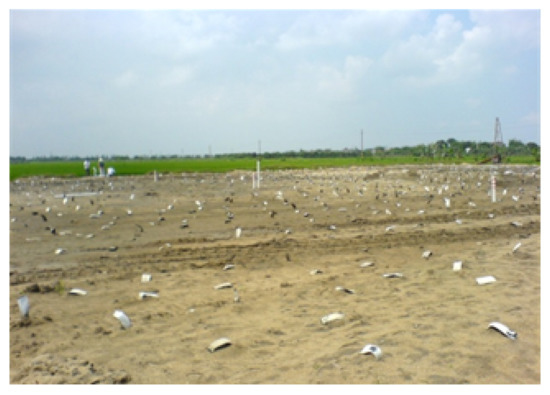 After land levelling, a sand cushion was laid first, and PVDs were then laid. It was observed that the PVDs were equidistantly distributed in a triangular pattern as per Figure 3, at a spacing of S1 = 1.2–1.5 m. The site layout is shown in Figure 5.