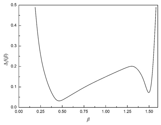A curve of △f(β) with β in the interval of [0.11, 1.55] was obtained with mathematical software, as shown in Figure 7.